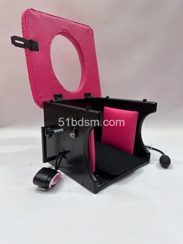 窒息箱(或称窒息盒)是女王凳的“铁血进阶版”,它不仅有座椅,还能像中世纪枷锁般,通过颈部固定将sub彻底锁在原位,sub的头被牢牢“囚禁”,动弹不得。箱体设计精妙,有两个关键开口: