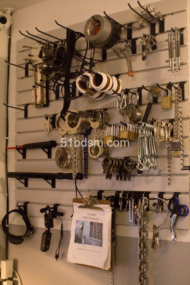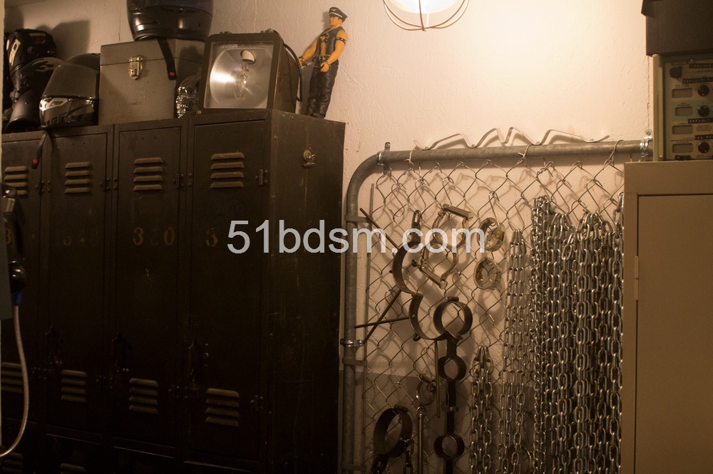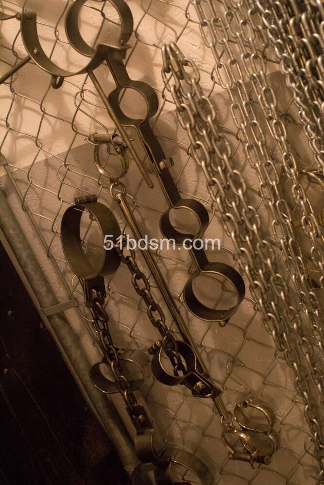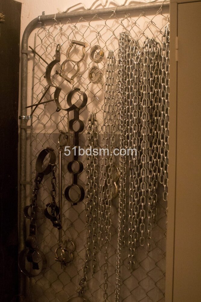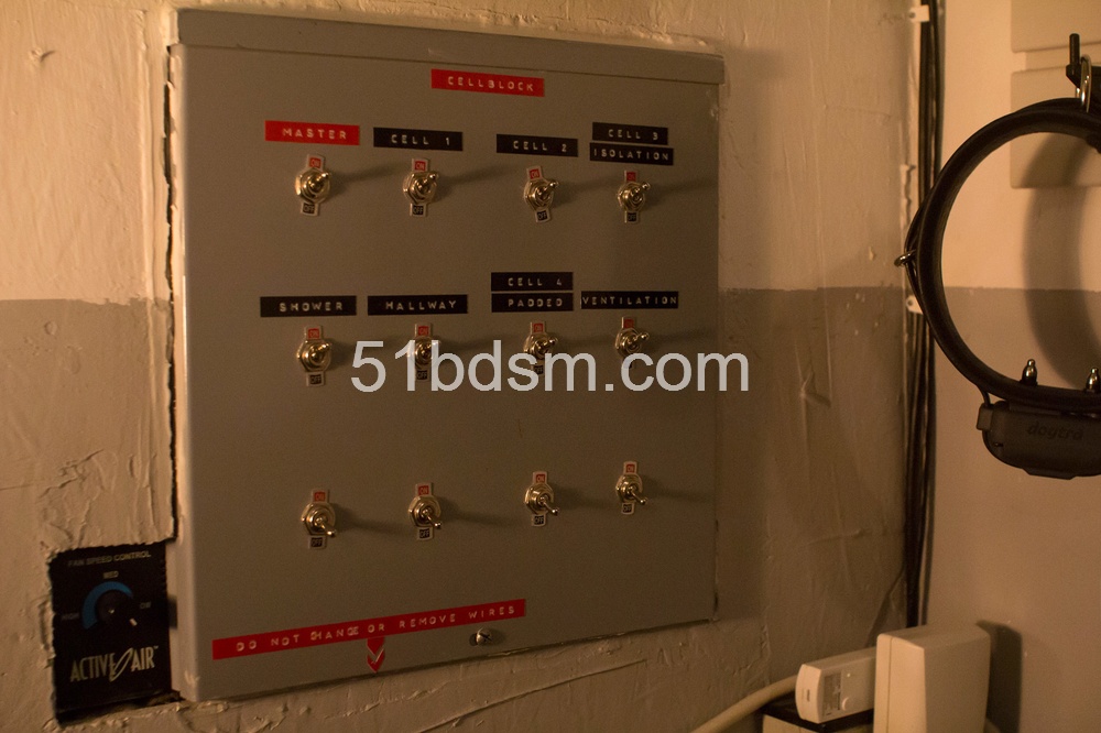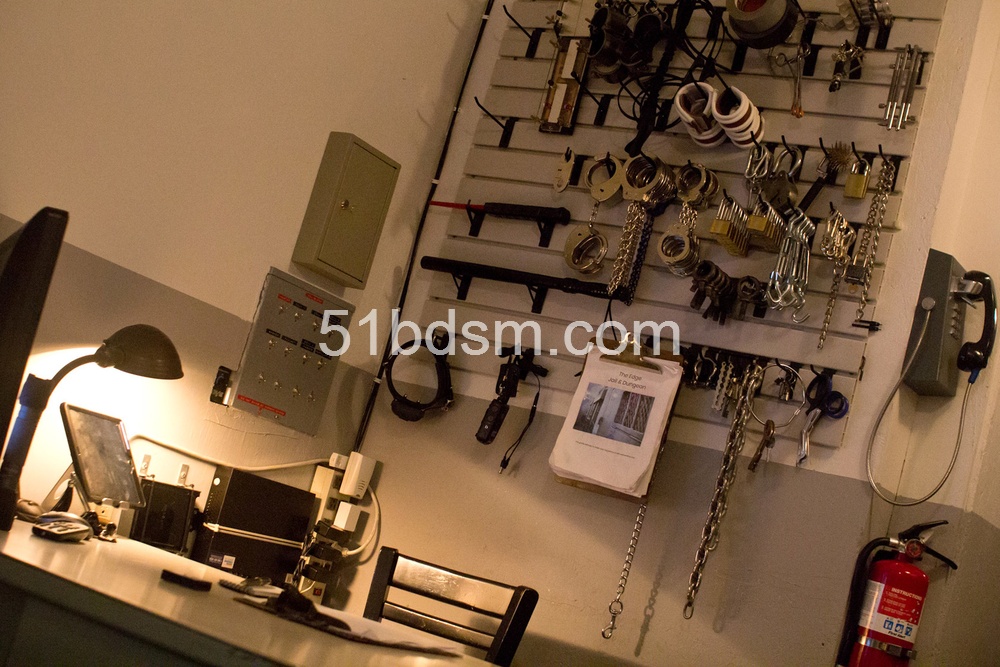 一推开门,监狱氛围立刻拉满。 门口正对着一张超级正式的狱警办公桌,上面摆着几台监控屏,这就是犯人入监处理区。 桌子后面的墙上挂满各式手铐、铁链、锁具,还有全套控制犯人的工具。 最显眼的就是一串老式大钥匙,每一把钥匙都又重又大,对应不同牢房的锁。光是看到这串叮当作响的钥匙,我就已经兴奋得不行,因为这里真的每扇门、每副镣铐都能真正锁死,这些都让我浮想联翩。 另外还有一支DSG电击项圈,随时待命。 桌上贴心地放着一块写字板,写满了灯光怎么开、换气扇怎么用、软包房注意事项等各种规则和操作说明,新手一看就会。